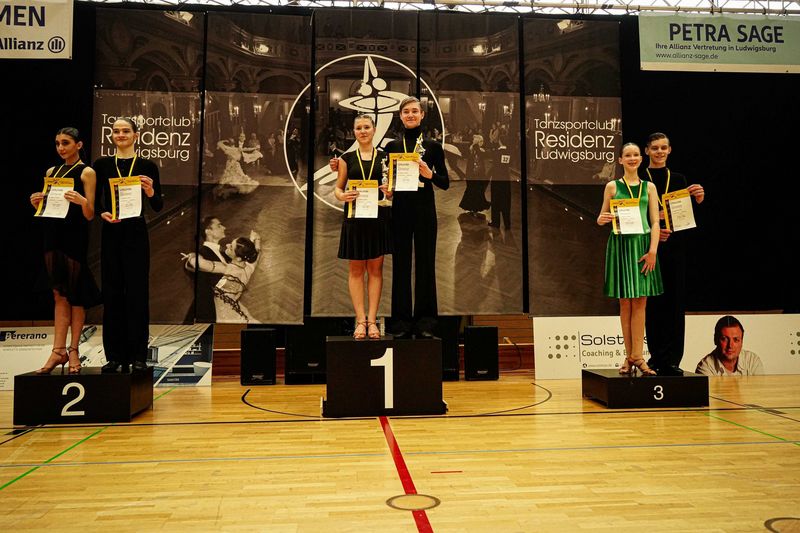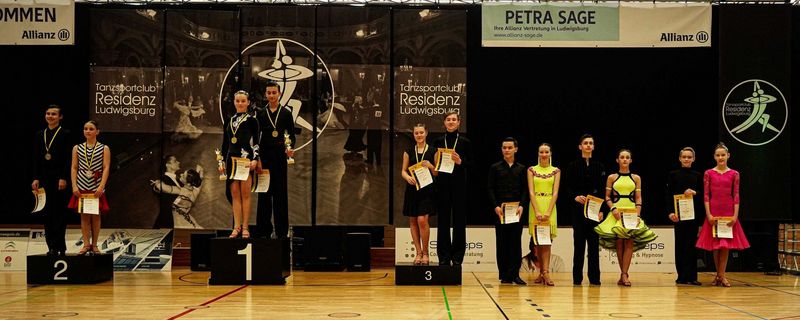 Sieben Paare waren es dann in der C-Klasse und das frisch aufgestiegene Calwer Paar holte sich die zweite Medaille: Bronze. Der Titel ging an Vincenzo D'Emma / Sophia Trumpold vom 1. TC Ludwigsburg. Mit einem großen Leistungssprung ging es dann in die B-Jugend. Und dort wurde es so richtig spannend: Mach dem letzten Tanz lagen zwei Paare gleichauf, der Jive musste entscheiden. Tom Müller / Lea Serban vom 1. Tanzsportclub Rastatt gaben noch einmal alles und sicherten sich Gold.
