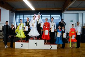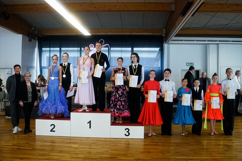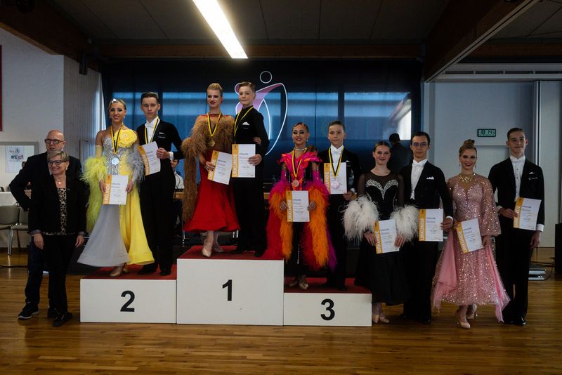 Den Abschluss des Tages bildeten die Paare der Jugend A mit drei Paaren. Auch in diesem hochklassigen Turnier hätte es beinahe ein Ergebnis mit allen möglichen Einsen gegeben – jeweils eine Zwei hatte sich im Langsamen Walzer, im Slowfox sowie im Quickstep bei der Wertung eingeschlichen. Dennoch eindeutig ging die Goldmedaille an Endrik Schmidt/Jennifer Kunke vom Tanzsportzentrum Stuttgart-Feuerbach. Über Silber durften sich Vincenzo D´Emma/Sophia Trumpold freuen. Komplettiert wurde das Finale mit dem frisch aufgestiegenen Paar Mykhailo Redko/Anastacia Kuhn.