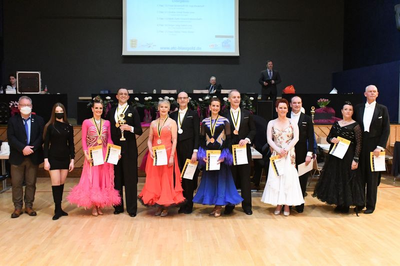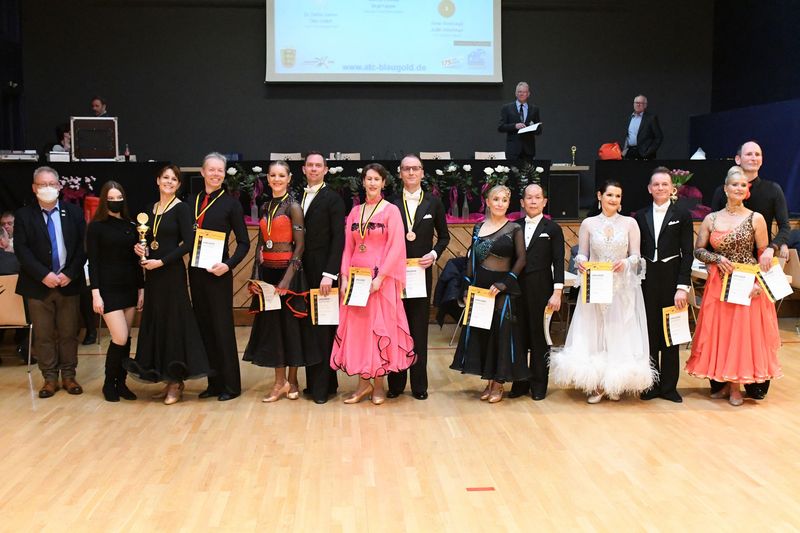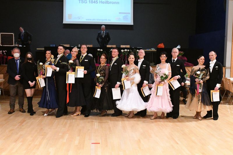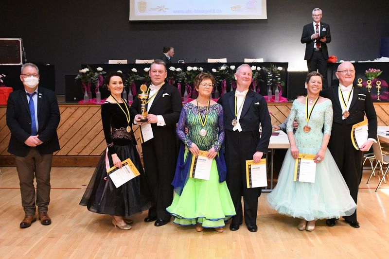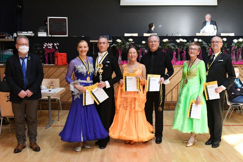 Die verbliebenen zehn Paare der Senioren II S Standard freuten sich über Verstärkung durch die A-Landesmeister und Aufsteiger Anja und Frank Westerhoff - so waren es Elf. Und ebenfalls um das Projekt Titelverteidigung ging es für Armin Balk / Anja Frieling-Rapp vom TOPTC Rot-Gold Schwäbisch Hall. Und auch 2022 konnten sie das Wertungsgericht überzeugen und holten sich einen weiteren goldenen Medaillensatz. Silber ertanzten sich Sven und Ramona Spengemann vom Tanzsportzentrum Stuttgart-Feuerbach und die Bronzemedaille ging an ihre Vereinskollegen Siegfried und Maria Klein.