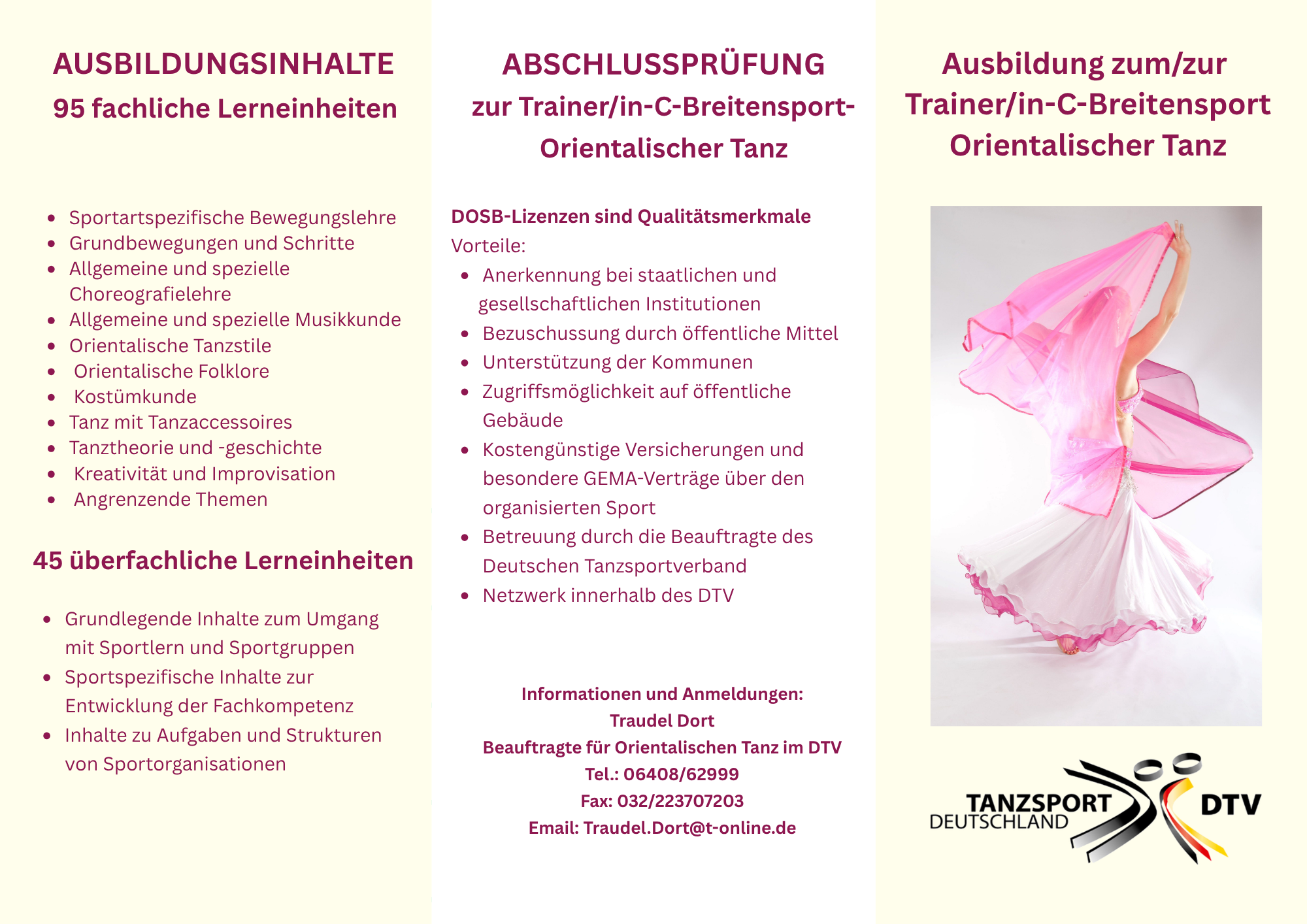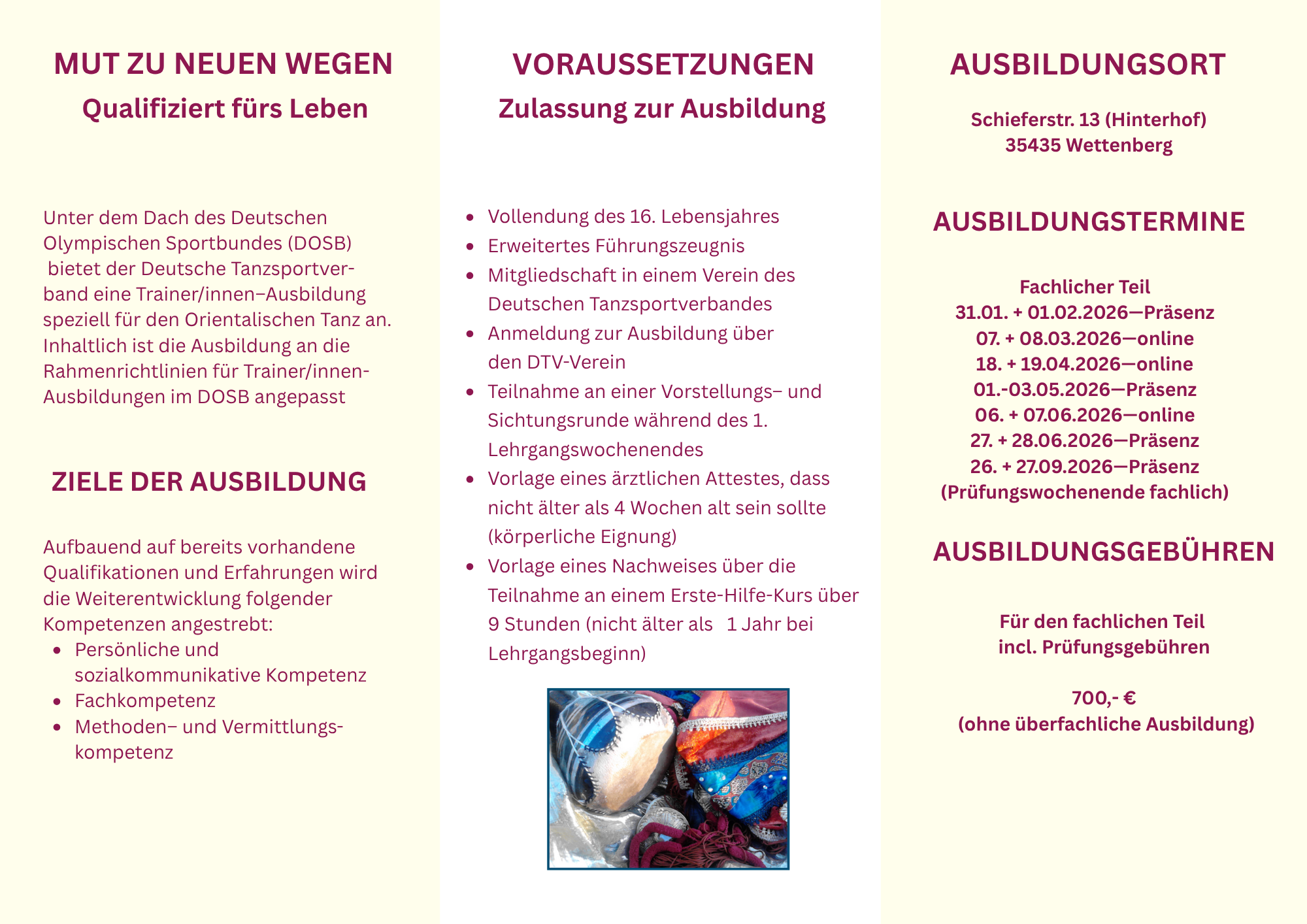 Noch Plätze frei !Lizenzerwerbsschulung Trainer*in C Breitensport Orientalischer Tanz (95 LE fachliche) – Anmeldeschluss bis 15.01.2026Der überfachliche Teil der Ausbildung (45 LE) kann in Kooperation mit allen Landestanzsportverbänden absolviert werden.Die Ausbildung wird auf Bundesebene angeboten, teilweise online u. teilweise in Präsenz.Der Präsenzunterricht findet in 35435 Wettenberg bei Gießen/ Hessen statt.Über die Inhalte und Termine der Ausbildung informiert Sie gerne:Traudel Dort, Beauftragte für Orientalischen Tanz beim Deutschen Tanzsportverband e.V.Tel.: 06408 / 62999 oder 0171 6429 278Mail: Traudel.Dort@t-online.de