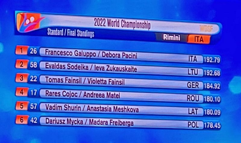 War es schon hauteng im Duell um Gold und Silber, so wurde das noch im Kampf um den vierten Platz getoppt. Hier standen sich die Rumänen Cojoc Rares/Matei Andreea sowie Vadim Shurin/Anastasia Meshkova aus Lettland gegenüber. Punktgleich im Langsamen Walzer, schlug die Nadel zugunsten der beiden Paare wechselhaft aus - und mit gerade einmal 0,011 Punkten Vorsprung durften die Rumänen dann direkt neben dem Podest Platz nehmen. Die Polen Dariusz Mycka/Madara Freiberga rundeten das Finale mit dem sechsten Platz ab.
